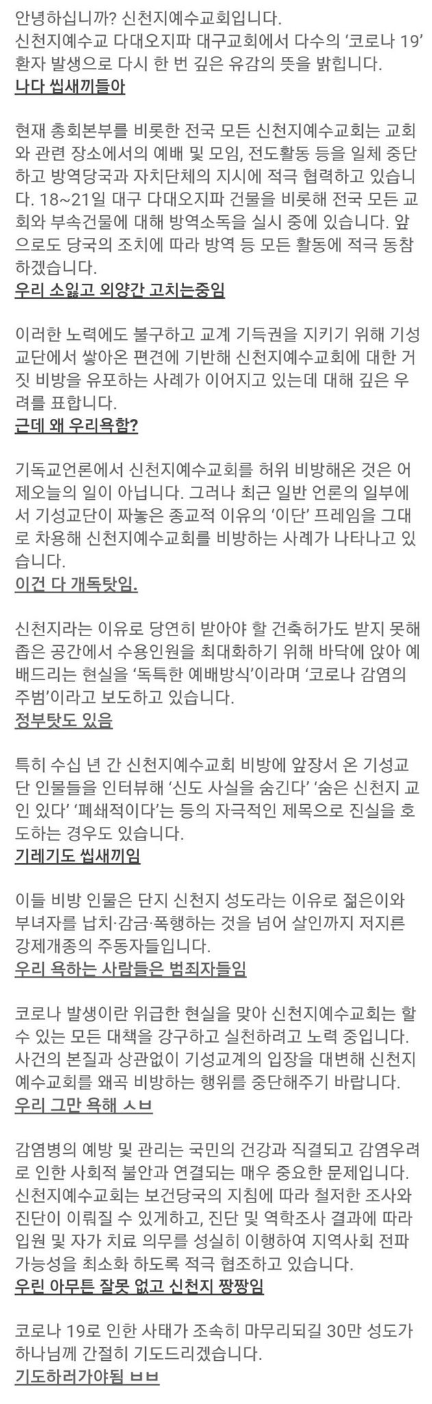 신천지 사과문 요약