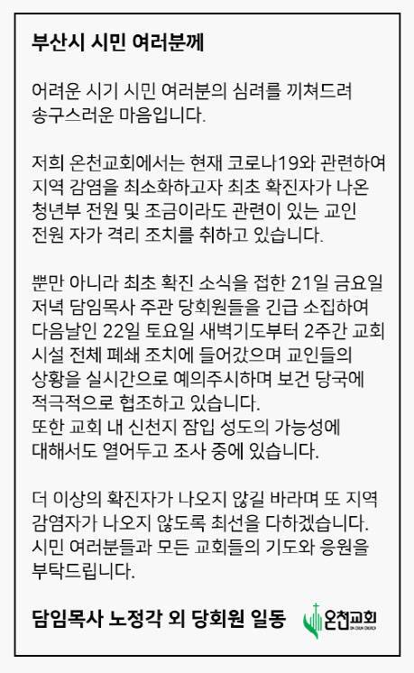 온천교회, 코로나19 집단확진에 "신천지 잠입 가능성도 조사"